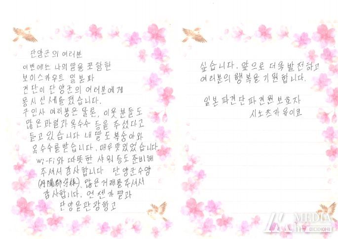 충북 단양군에서 지난 8월 8일부터 11일까지 3박 4일간 머물렀던 잼버리 일본 스카우트 대원의 어머니가 귀국한 딸로부터 단양에서의 이야기를 들은 후 감사의 마음을 담은 편지를 보내와 훈훈함을 자아내고 있다.