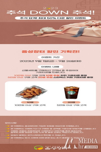 미디어아워 이다정 기자 | 음성군은 민족최대 명절인 추석을 맞아 이번 달 26일까지 음성군 명품작물 온라인 쇼핑몰 ‘음성장터’에서 추석맞이 기획전을 진행한다.