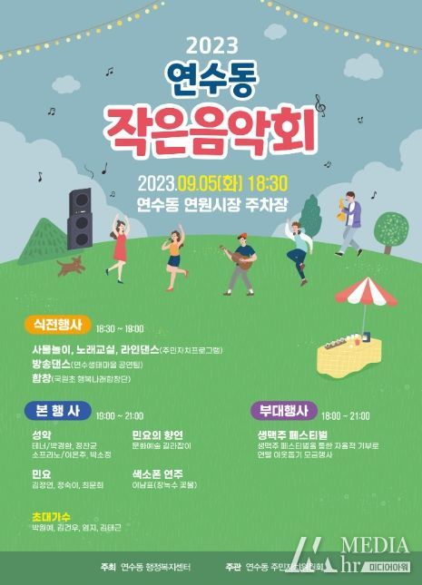 미디어아워 이다정 기자 | 충주시 연수동 주민자치위원회는 아직 더위가 채 가시지 않은 초가을 ‘2023년 연수동 작은 음악회’를 오는 5일 저녁 6시 30분 연원시장 주차장에서 개최한다고 밝혔다.
