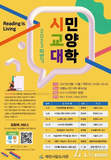 미디어아워 이다정 기자 | 제천시립도서관은 시민들의 지적 호기심 충족과 인문적 소양을 높이기 위해 9월 6일부터 12월 6일까지 총 8회에 걸쳐 「2023년 하반기 시민교양대학」을 운영한다.
