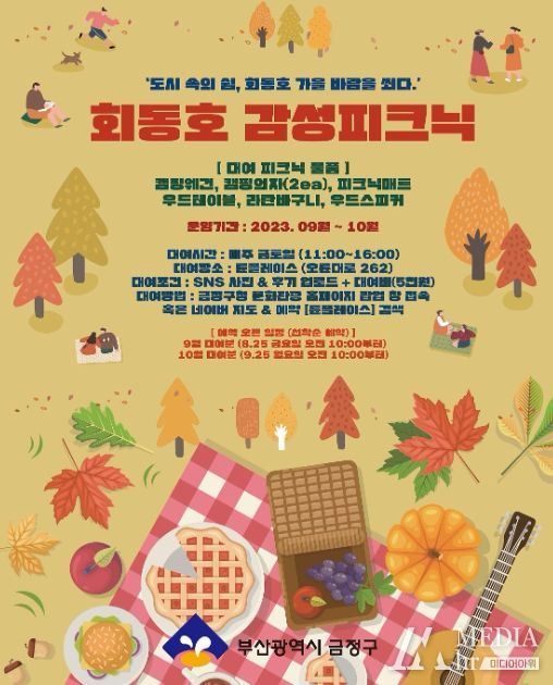 미디어아워 이다정 기자 | 부산시 금정구는 오는 9월 8일부터 10월 28일 금~일 11시~16시 총 20회 회동호 로컬 특화사업‘회동호 감성피크닉’을 운영한다고 밝혔다.