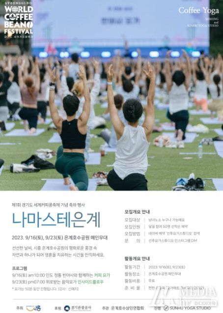 미디어아워 이다정 기자 | 시흥가 오는 10월 7일에서 8일까지 열리는 ‘제1회 경기도 세계 커피콩 축제’를 기념하는 축하 행사로 9월 16일과 23일 은계호수공원 주 무대에서 요가 프로그램인 ‘나마스테 은계’를 진행한다.