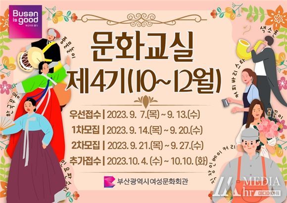 미디어아워 이다정 기자 | 부산시 여성문화회관은 시민들에게 전문적인 능력개발 및 삶의 질 향상을 위한 폭넓은 기회를 제공하고자 '2023년 제4기 문화교실' 수강생을 오는 9월 7일부터 모집한다고 밝혔다.