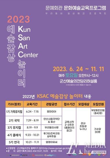 미디어아워 이다정 기자 | 군산시는 예술의전당이 국비공모사업인 23년 문예회관 문화예술교육프로그램 지원사업인 'KSAC 예술감상 놀이터' 4기 클래식 수업을 오는 23일부터 시작한다고 밝혔다.