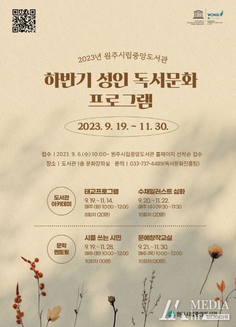 미디어아워 이다정 기자 | 원주시립중앙도서관은 시민의 문화적 욕구 충족을 위해 성인 대상으로 하반기 독서문화프로그램을 운영한다.