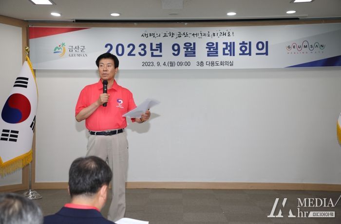 미디어아워 이다정 기자 | 박범인 금산군수는 4일 군청 다목적회의실에서 열린 월례회의에서 “2023 충청남도체육대회 및 제41회 금산세계인삼축제 개최가 얼마 남지 않았다”며 “행사 성공개최를 위해 힘‧슬기를 모으자”고 말했다.