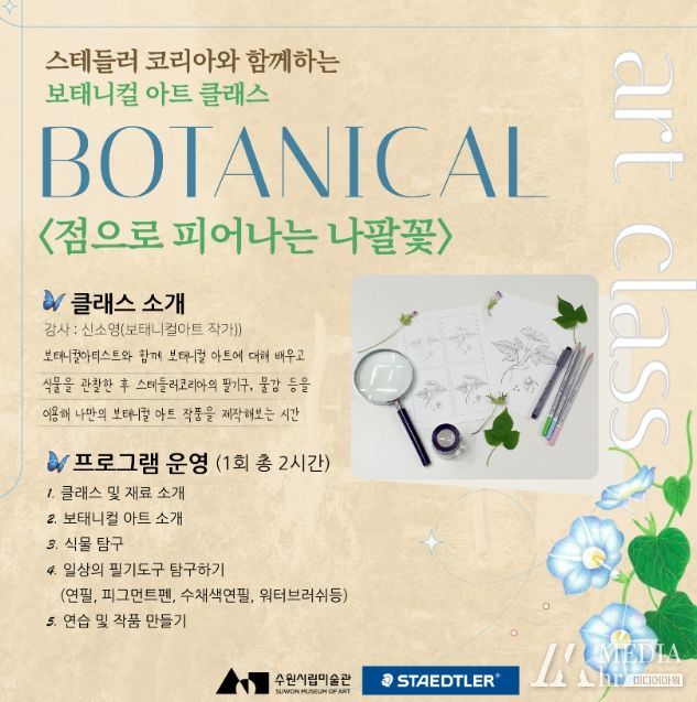 미디어아워 이다정 기자 | 경기도 수원시 수원시립미술관은 독일 문구 기업 스테들러코리아와 함께 SUMA 뮤지엄데이 '보태니컬 아트 클래스 : 점으로 피어나는 나팔꽃'을 9월 23일 수원시립미술관에서 개최하며 9월 5일부터 참여자를 모집한다.