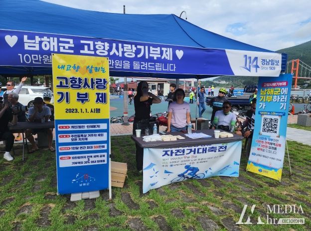 미디어아워 이다정 기자 | 남해군은 지난 3일 열린 제5회 보물섬 남해 자전거대축전 개막식에서 ‘고향사랑기부제 홍보부스’를 운영했다. 제5회 보물섬 남해 자전거대축전은 남해군체육회가 주최한 행사로 설천면 노량에서 출발해 해안도로를 거쳐 삼동면 지족까지 이르는 왕복 70㎞ 구간에서 펼쳐졌다.