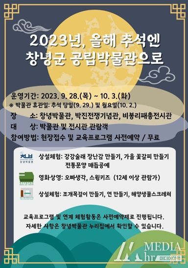 미디어아워 이다정 기자 | 창녕군은 우리나라 고유의 명절 중 하나인 추석을 맞아 연휴가 시작되는 이번 달 28일부터 다음 달 3일까지 창녕박물관과 박진전쟁기념관, 비봉리패총전시관 등 군 공립박물관에서 온 가족이 함께 즐길 수 있는 문화행사를 개최한다고 밝혔다.