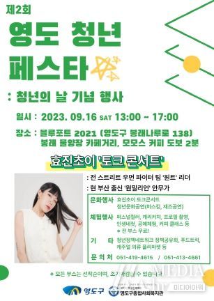 미디어아워 이다정 기자 | 부산 영도구종합사회복지관은 영도구와 함께 작년에 이어 올해 2회째로 9월 16일 청년의 날 맞이 청년 축제 ‘영도 청년 페스타’를 블루포트2021(봉래동)에서 개최한다.