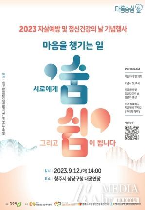 미디어아워 이다정 기자 | 청주시 4개 보건소는 2023년 ‘세계 자살예방의 날 및 정신건강의 날’을 맞이해 오는 9월 12일 오후 2시 청주시 상당구청 대공연장에서 문화행사를 개최한다고 밝혔다.