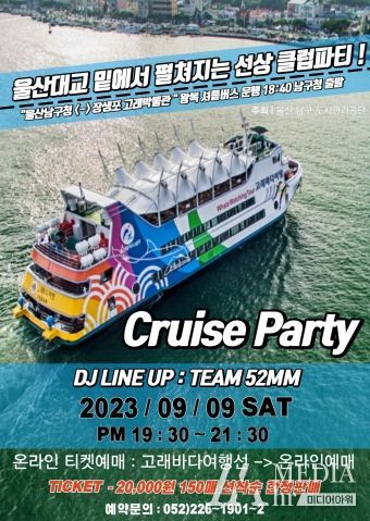 미디어아워 이다정 기자 | 울산남구도시관리공단(이사장 이춘실)은 오는 9일MZ세대를 위한 선상 EDM 파티 특별운항을 한다고 4일 밝혔다.