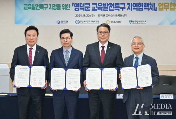 미디어아워 임다연 기자 | 영덕군은 교육발전 특구 시범지역 선정을 위해 영덕군의회, 영덕교육지원청, 대구한의대학교와 지난 20일 지역 협력체 업무 협약을 체결했다.