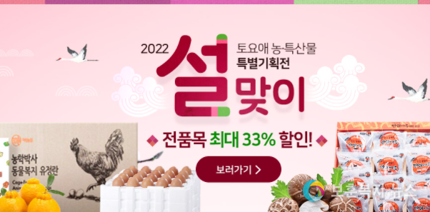 구매 방법은 PC 또는 모바일을 통해 포털사이트에서 ‘토요애’를 검색하여 쇼핑몰로 접속하여 구매할 수 있으며, 설맞이 특판행사 코너에서 행사상품들만 모아볼 수 있다.
