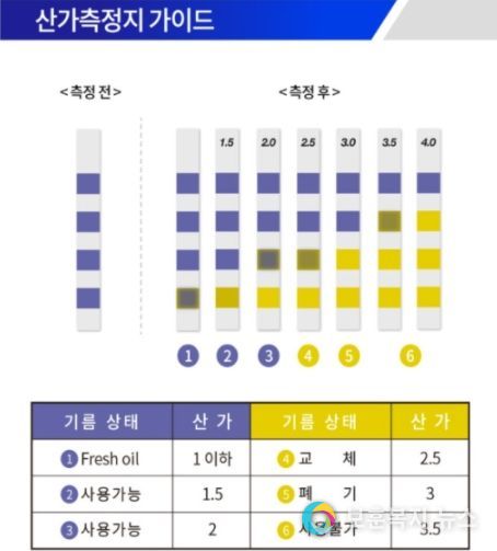 식품의 산가 기준은 3.0이하 이며, 사용 중인 튀김용 유지에 산가 측정지를 2~3초 담근 뒤 30초 후 색상변화를 통해 산가를 측정한다. 지속적인 튀김유 관리를 위해 대상업소 당 산가측정지 1통(50매), 산가측정 설명지, 영업주 자율점검표가 제공될 예정이다.