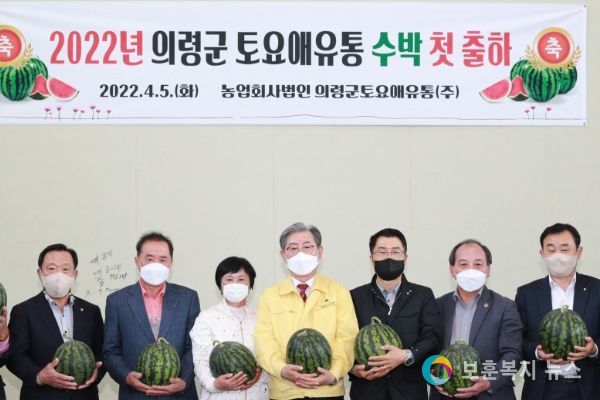 토요애유통은 지난 5일 의령군수, 농협 및 농업기술센터 관계자와 농가 등 20여 명이 참여한 가운데 2022년 수박 사업 성공기원제와 함께 수박 출하를 시작하였다.