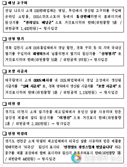 주요 위반사례는 충남 00군 소재 000영농조합법인에서는 청양산과 타 지역(예산, 부여)산 구기자를 혼합하여 인터넷 쇼핑몰에서 통신판매하면서 구기자의 원산지를 “청양산”으로 거짓표시하여 판매(위반물량 6톤 / 위반금액 2억 1천만 원)하다 적발되었고, 대구광역시 소재 000생산농가에서 대구 달성군에서 생산한 참외와 성주산 참외를 혼합하여 관내 농협에 판매하면서 참외의 원산지를 “성주 참외”로 거짓표시하여 판매(위반물량 180톤, 위반금액 7억 2천만 원)하다 적발되었다.