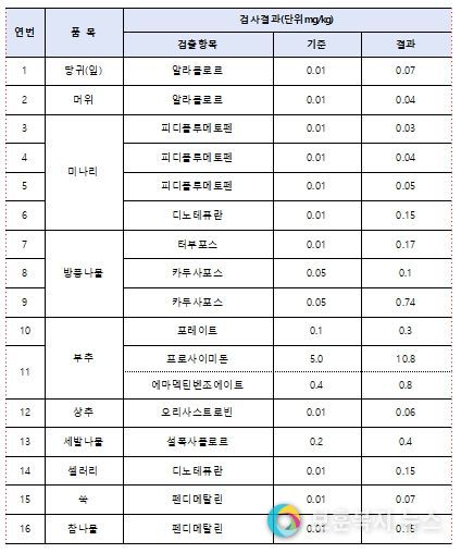 수거·검사 결과, 일부 지역에서 생산하고 있는 미나리, 방풍나물, 부추, 당귀, 머위, 상추, 세발나물, 셀러리, 쑥, 참나물에서 잔류농약이 허용기준보다 초과 검출됐다.
