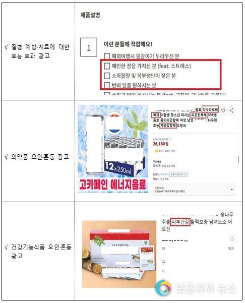 식약처는 이번 점검에서 언론에 제품 홍보를 많이 하거나 소비자의 관심도가 높은 식품 등을 판매하는 온라인 게시물 총 577건을 대상으로 질병 예방‧치료 효능‧효과, 건강기능식품 오인‧혼동 등 부당광고 여부를 집중 점검했다.