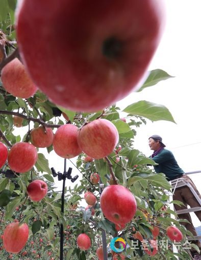 보훈복지뉴스 유서진 기자 | 추석을 10여일 앞둔 29일 오전 경남 함양군 서하면 사과 농장에서 신근수씨가 잘 익은 고랭지 홍로사과를 수확하고 있다.