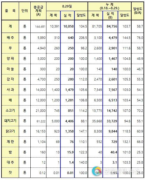 먼저 농식품부는 추석 성수품 수요가 본격적으로 시작되는 추석 3주 전(8월 18일)부터 정부 비축, 농협 계약재배 물량 등을 활용하여 14개 추석 성수품을 평시 대비 1.5배 수준으로 확대·공급하고 있다. 8월 29일 현재 추석 성수품 공급물량은 85천 톤으로 당일까지 공급계획 82천 톤 대비 103.7%, 전체 공급물량 144천 톤 대비 58.7%의 실적을 보이고 있다.
