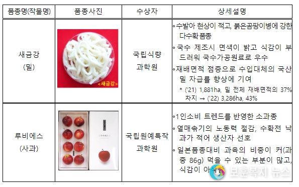 농촌진흥청은 대한민국 우수 품종상 농림축산식품부 장관상에 밀 ‘새금강’(국립식량과학원 강천식 연구관)과 사과 ‘루비에스’(국립원예특작과학원 권영순 연구사) 총 2종이 선정됐다고 밝혔다.