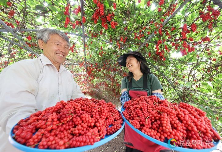 보훈복지뉴스 유서진 기자 | 14일 경남 함양군 백전면 강산골 직골농장에서 강석구씨 부부가 해발 700m 고랭지에서 빨갛게 잘 익은 새콤달콤한 오미자를 수확하고 있다.
