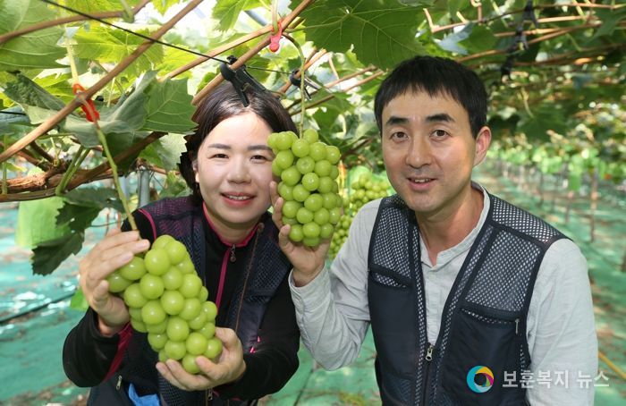 보훈복지뉴스 유서진 기자 | 5일 산청군 오부면 소재 지리산맘스 영농조합법인 대표 손국일-한향임 부부가 샤인머스캣을 선보이고 있다.