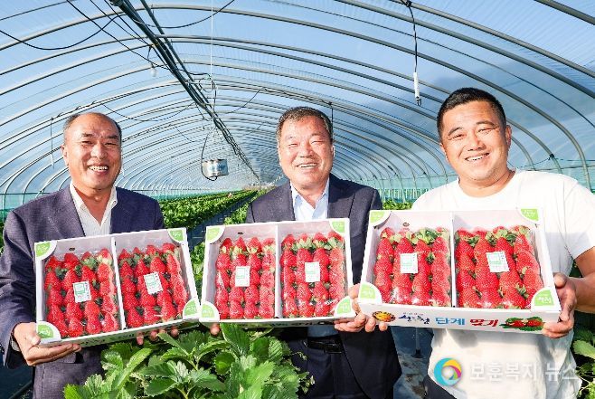 보훈복지뉴스 유서진 기자 | 18일 산청군 신등면 단계리 권영민씨 농가에서 이승화 산청군수 등 관계자들이 ‘지리산 산청 딸기’를 선보이고 있다.