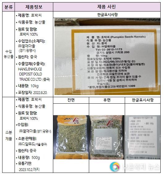 회수 대상은 ‘(주)열매마을(경기 광명시)’에서 수입한 중국산 호박씨(포장일 : 2022년 8월 20일)와 이를 ‘㈜디알푸드(서울 중구)’에서 소분‧판매(유통기한 : 2023년 10월 2일)한 제품이다.