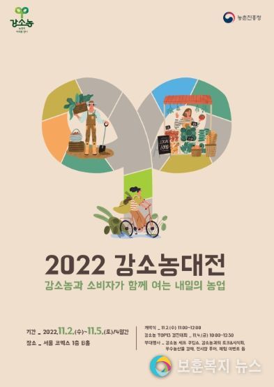 농촌진흥청은 11월 2일부터 5일까지 서울 강남구 코엑스 전시관 비(B)홀에서 ‘강소농과 소비자가 함께 여는 내일의 농업’이라는 주제로 ‘2022 제8회 강소농대전’을 개최한다.