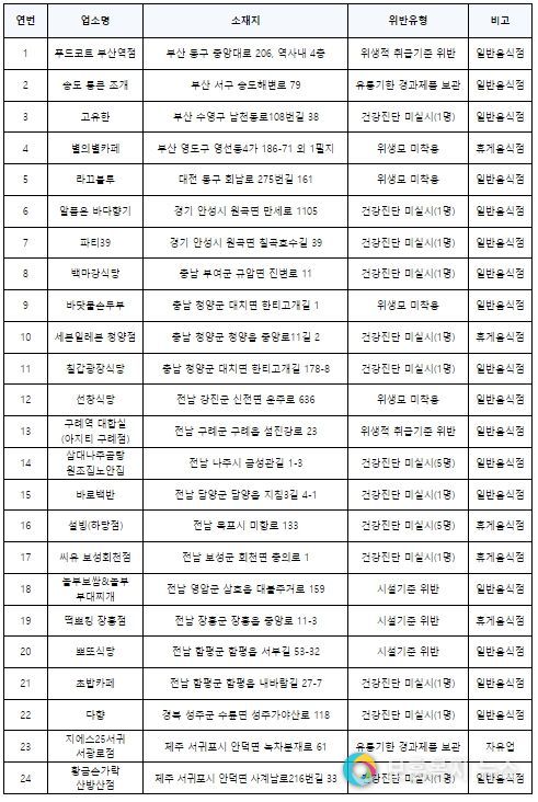 보훈복지뉴스 유서진 기자 | 식품의약품안전처는 가을 나들이 철을 맞아 국‧공립공원, 유원지 등 다중이용시설 내의 식품취급업소 총 5,650곳을 대상으로 10월 4일부터 7일까지 17개 지방자치단체와 함께 점검한 결과, 「식품위생법」을 위반한 24곳(0.4%)을 적발해 관할 관청에 행정처분을 요청했다.