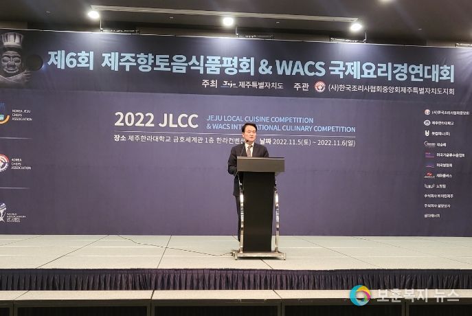 보훈복지뉴스 유서진 기자 | 김희현 제주특별자치도 정무부지사는 6일 사단법인 한국조리사협회 제주도지회(회장 신동진)가 주관한 제6회 제주향토음식 품평회 및 WACS 국제요리 경연대회(70개팀·140명 참여)에 참석해 최우수상 수상팀에게 상패를 수여하고, 경연자들을 격려했다.