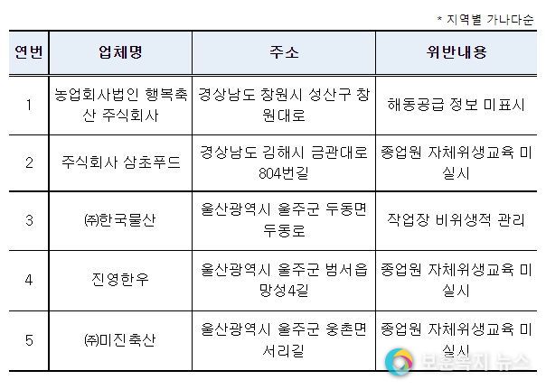 점검 결과, 주요 위반 내용은 ▲종업원 자체위생교육 미실시(3곳) ▲집단급식소 해동공급 정보 미표시(1곳) ▲작업장 비위생적 관리(1곳)이며, 이번에 적발된 업체는 관할 지자체의 행정처분 등의 조치 후 6개월 이내에 다시 점검해 개선 여부를 확인할 예정이다.