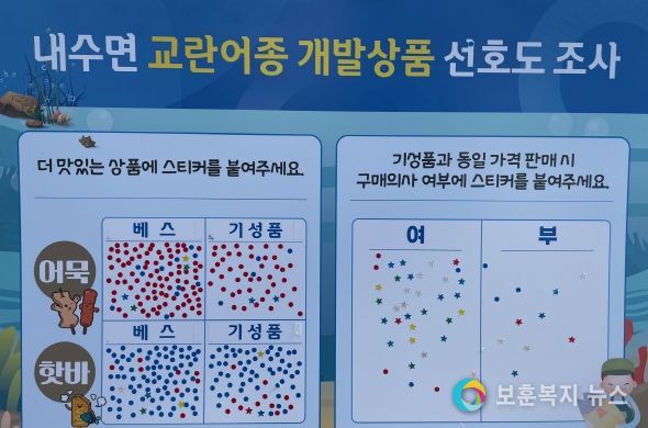 블라인드 선호도 조사 결과, 무효표를 제외하고 어묵 제품은 배스에 스티커를 붙인 사람이 117명, 일반 시제품이 49명으로 나타나 배스 활용 제품을 꼽은 사람이 130% 정도 압도적으로 많았다.