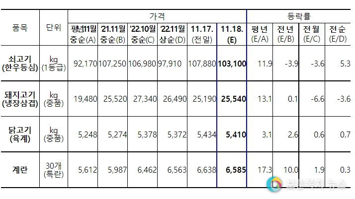 2022년 11월 현재 주요 축산물인 한우·돼지·계란·닭고기의 생산 및 공급 기반은 전반적으로 안정적인 수준이다. 다만 고병원성 조류인플루엔자, 아프리카돼지열병 등 가축질병 발생 상황, 국제 곡물 가격·환율 상승 등에 따른 사료 가격 동향 등은 수급 불안 요인으로 작용할 전망이다.