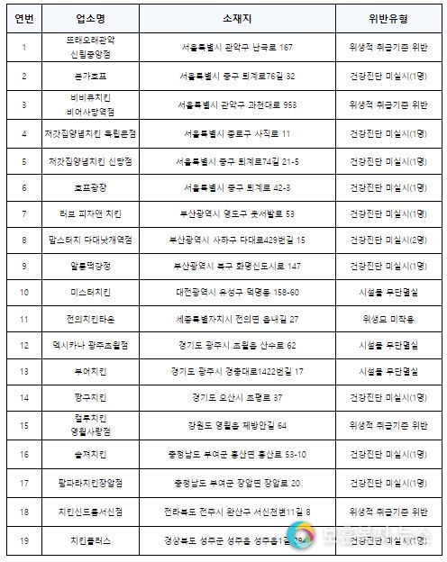 주요 위반 내용은 ▲건강진단 미실시(11곳) ▲위생적 취급기준 위반(4곳) ▲영업시설 무단멸실(3곳) ▲위생모 미착용(1곳)이다.
