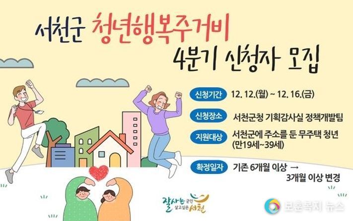 보훈복지뉴스 유서진 기자 | 서천군이 추진하는 ‘청년 행복 주거비 한시 특별지원’의 4분기 신청을 오는 12일부터 16일까지 받는다고 5일 밝혔다.