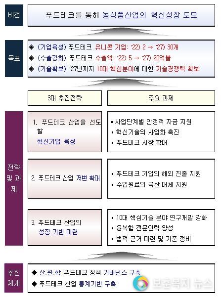 농식품부는 체감도 높은 정책을 수립하기 위해 총 25회에 걸친 푸드테크 기업 간담회와 전문가 연구 등을 추진했고, 이를 바탕으로 2027년까지 푸드테크 거대 신생 기업(유니콘 기업) 30개 육성, 푸드테크 수출액 20억 불 달성을 목표로 하는 ’푸드테크 산업 발전방안’을 수립했다.