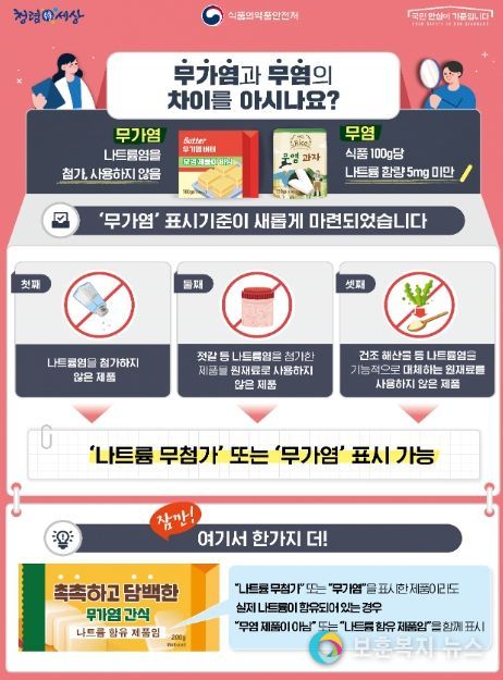 기존에는 식품 제조‧가공 시 나트륨을 제거하거나 낮춰 최종 제품 나트륨 함량이 5mg/100g 미만인 경우(‘무염’ 표시기준)에 ‘나트륨 무첨가’, ‘무가염’ 표시를 할 수 있었지만, 앞으로 나트륨염을 첨가하지 않은 경우 표시할 수 있도록 기준을 마련했다.