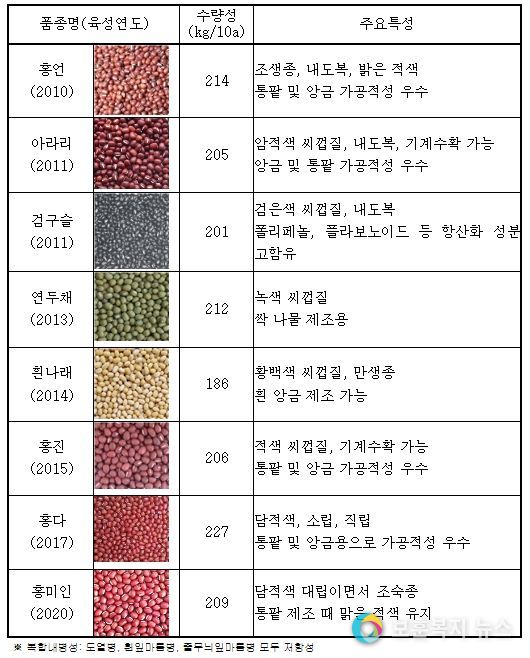 농촌진흥청은 팥을 활용한 다양한 건강 영양식을 접할 수 있도록 소비자 입맛과 추세에 맞는 ‘홍언’, ‘홍진’, ‘아라리’, ‘홍다’, ‘홍미인’, ‘검구슬’ 등 다양한 팥 품종을 개발해 보급하고 있다.