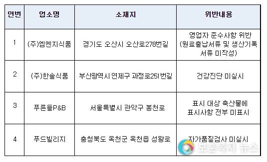 점검 결과 주요 위반내용은 ▲영업자 준수사항 위반 ▲건강진단 미실시 ▲표시사항 미표시 ▲자가품질검사 미실시이며, 이번에 적발된 업체는 관할 지자체 행정처분 등의 조치 후 6개월 이내에 다시 점검해 개선 여부를 확인할 예정이다.