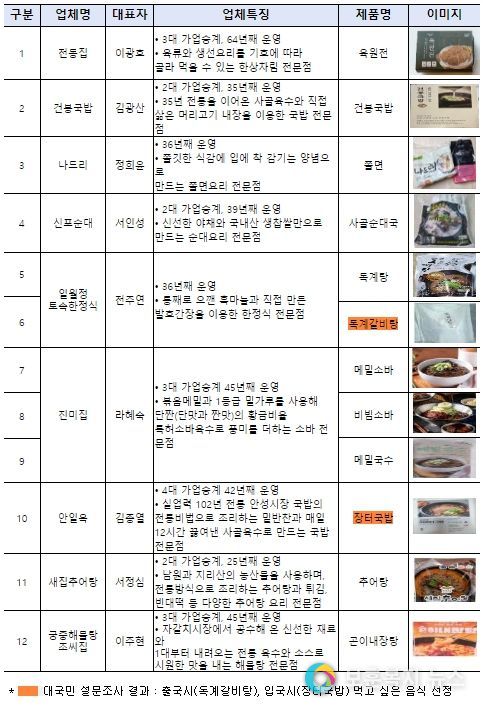 선보이는 메뉴는 ▲전북 ’진미집’의 ‘비빔소바’ ‧ ‘메밀소바’ ‧ ‘메밀국수’, ▲전남 ‘건봉국밥’의 ‘돼지국밥(건봉국밥)’, ▲인천 ‘신포순대’의 ‘사골순대국’, ▲경북 ‘나드리’의 ‘쫄면(간-쫄면)’, ▲대구 ‘일월정’의 ‘삼계탕(흑마늘독계탕)’ ‧ ‘설렁탕(독계설렁탕)’, ▲경기 ‘안일옥’의 ‘국밥(장터국밥)’, ▲인천 ‘전동집’의 ‘동그랑땡(육원전)’, ▲전북 ‘새집’의 ‘추어탕(새집추어탕)’, ▲부산 ‘궁중해물탕 조씨집’의 ‘내장탕(곤이내장탕)’이다.