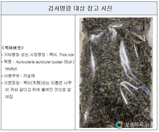 보훈복지뉴스 유서진 기자 | 식품의약품안전처는 수입자가 수입식품 등에 대해 검사를 실시해 안전성을 입증해야만 국내로 들여올 수 있는 ‘검사명령’을 12월 24일부터 중국에서 수입되는 건조 목이버섯(잔류농약 항목)에 대해 적용한다.