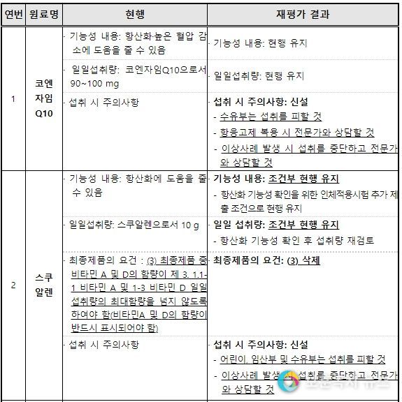 식약처는 2017년부터 건강기능식품 기능성 원료에 대한 재평가를 매년 실시해오고 있으며, 작년까지 총 55개 원료에 대한 재평가 결과 54개 원료에 대해 기준‧규격을 개정하는 등 지속적으로 안전성‧기능성을 관리해 오고 있다.
