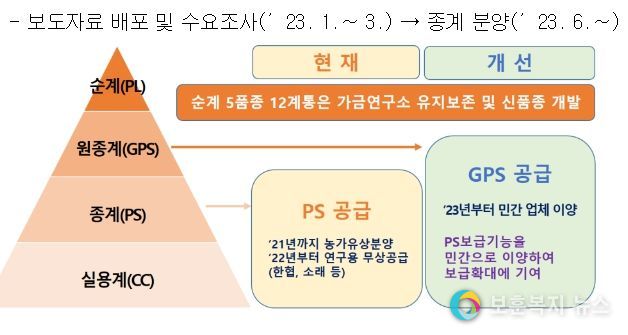 또한, 기존 국립축산과학원과 한국농업기술진흥원이 추진했던 우리맛닭 씨닭 분양 체계를 민간주도형 보급 체계로 전환하는 데 협력하기로 했다. 국립축산과학원은 ㈜한협원종에 우리맛닭 원종계*를 공급하고, 2023년부터는 ㈜한협원종에서 농가에 씨닭을 보급한다는 계획이다. 우리맛닭 씨닭 보급 관련 구체적인 사항은 별도로 안내할 예정이다.