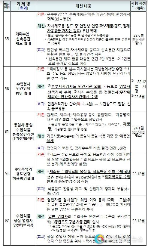 작년 8월 발표한 ‘식의약 규제혁신 100대 과제’에 포함된 ①계획수입 신속통관 대상 확대(35번) ②민간 시험·검사기관에 의뢰 가능한 검사대상 확대(58번) ③동일사 동일수입수입식품 분류요건 개선(81번) ④수입목적 외 용도변경 허용 범위확대(91번) ⑤영업자 안전관리 역량에 기반한 영업자 차등관리(97번) 5개 과제를 추진한다.