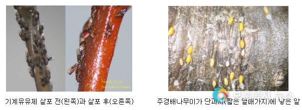 다만, 언 피해가 자주 발생하는 과수원에서는 기계유유제 대신 주경배나무이 적용 약제를 권장 농도에 맞게 희석한 뒤 뿌려준다.