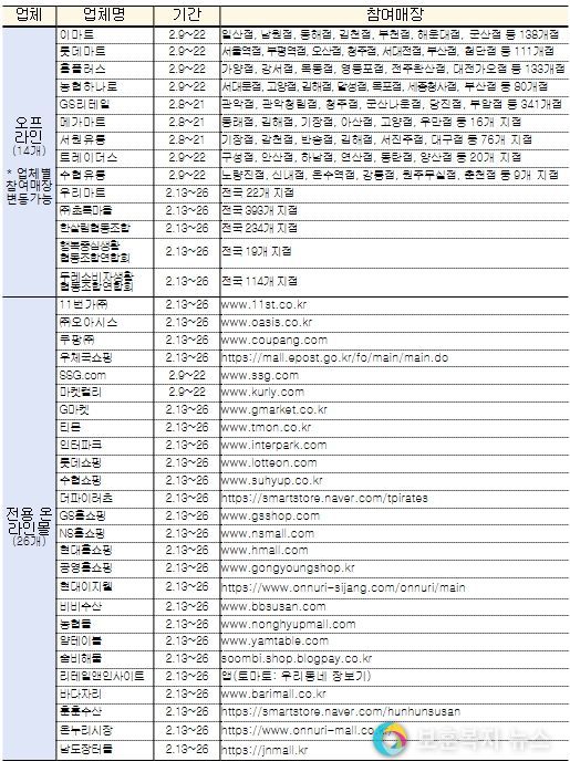 이번 행사에는 이마트, 롯데마트, 홈플러스, 지에스(GS) 리테일, 수협바다마트, 농협하나로마트, 우리마트 등 14개 오프라인 업체와 우체국쇼핑, 마켓컬리, 쿠팡, 수협쇼핑 등 26개 온라인 쇼핑몰이 참여한다. 해양수산부는 1인당 1만 원 한도로 20% 할인을 지원하며, 참여 업체의 자체 할인을 추가해 소비자들은 최대 50%까지 할인된 가격에 수산물을 구매할 수 있다. 할인행사 참여 매장 등 그 밖에 자세한 내용은 행사 공식 누리집에서 확인하면 된다.