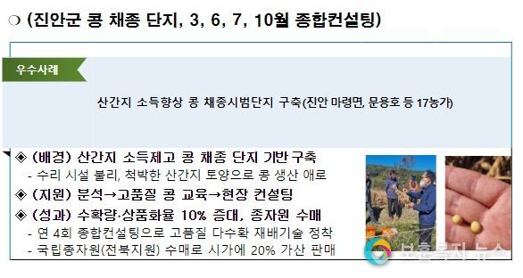 전북 진안군에서 ‘선풍’ 콩 채종 시범단지를 운영하는 문용호 농업인은“흙갈이와 씨 뿌림, 생육 관리 등을 통틀어 모두 4회에 걸쳐 상담과 교육을 받았다. 현장을 방문한 전문가가 알려준 토양 개량 방법을 적용해 콩 농사에 많은 도움이 됐다.”라며 만족감을 표했다.